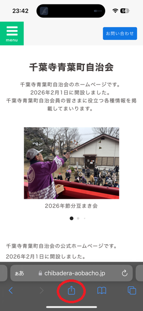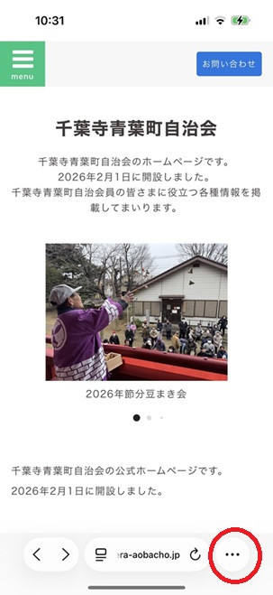 ①iPhone上で千葉寺自治会ホームページを開き、画面下部にある赤丸部分をタップします