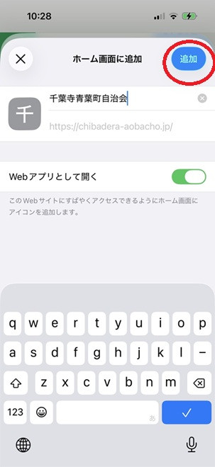 ③「ホーム画面に追加」の赤丸部分(追加)をタップすると、ホーム画面にアイコンが追加されます